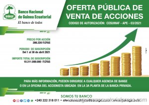 Gobierno Los socios del BANGE suscriben el 78% de las nuevas acciones emitidas El Banco Nacional del Guinea Ecuatorial (BANGE) informa al público en general que, tras la aprobación de la ampliación de capital por la Junta Extraordinaria de Accionistas celebrada el pasado 10 de octubre de 2020, por un valor de cuarenta mil millones de FCFA (40.000.000.000) FCFA, los socios han ejercido su derecho de suscripción preferente, suscribiendo el 78% de las nuevas acciones emitidas, quedando pendiente por suscribir el 22% de nuevas acciones.