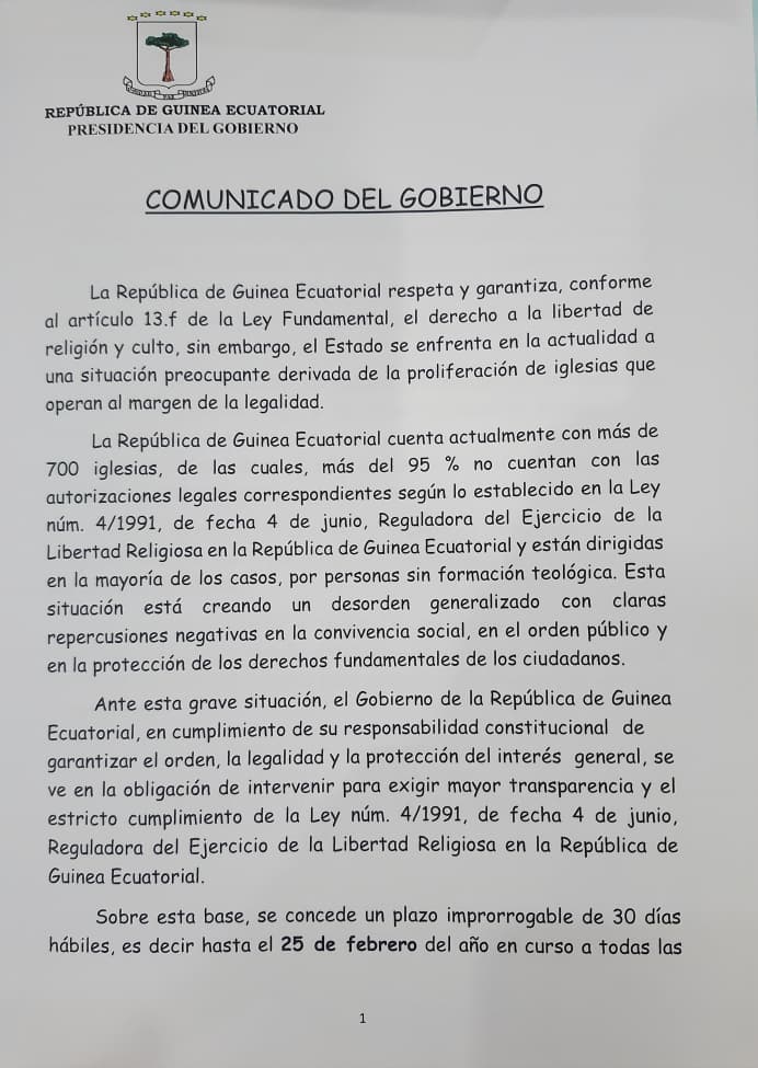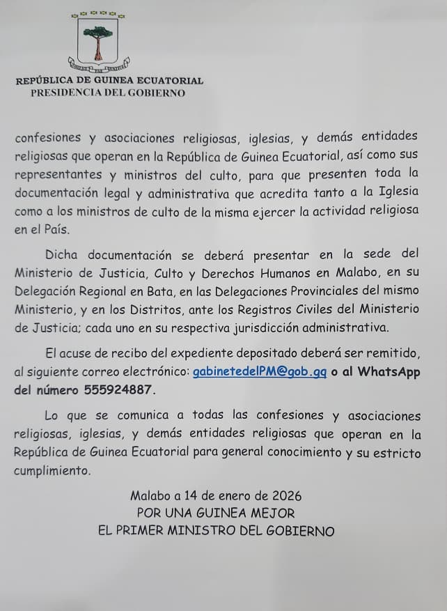 Un comunicado oficial que recoge varias medidas que servirán para una mejor regulación y control del sector culto de Guinea Ecuatorial ha sido analizado esta mañana del 14 de enero, en un encuentro presidido por el Primer Ministro del Gobierno, Manuel Osa Nsue, en la sede de la Presidencia del Gobierno de Malabo II. Adjuntamos el contenido completo de dicho comunicado.