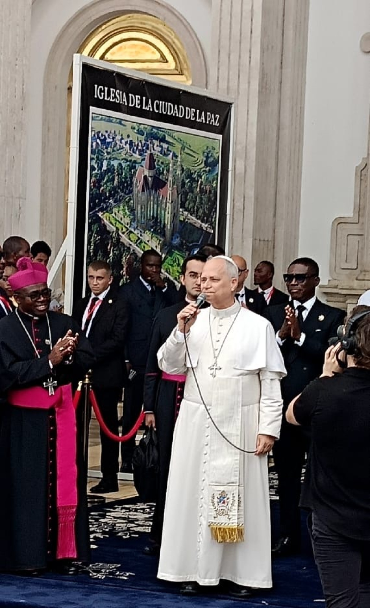 A su llegada al templo, el Santo Padre fue recibido en la puerta principal por la Pareja Presidencial y el Vicepresidente de la República. En ese mismo momento tuvo lugar la bendición de la primera piedra de la futura iglesia de la Ciudad de La Paz, un acto simbólico que marca el inicio de este proyecto religioso y refuerza la presencia de la Iglesia en el país.