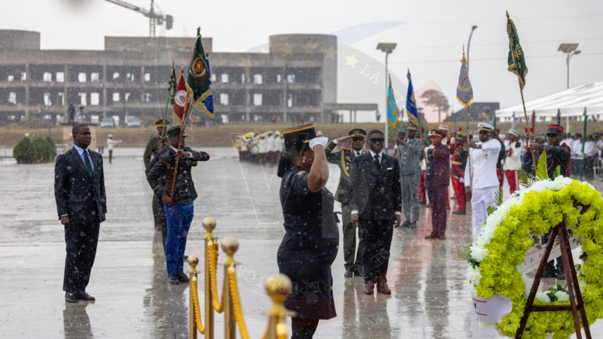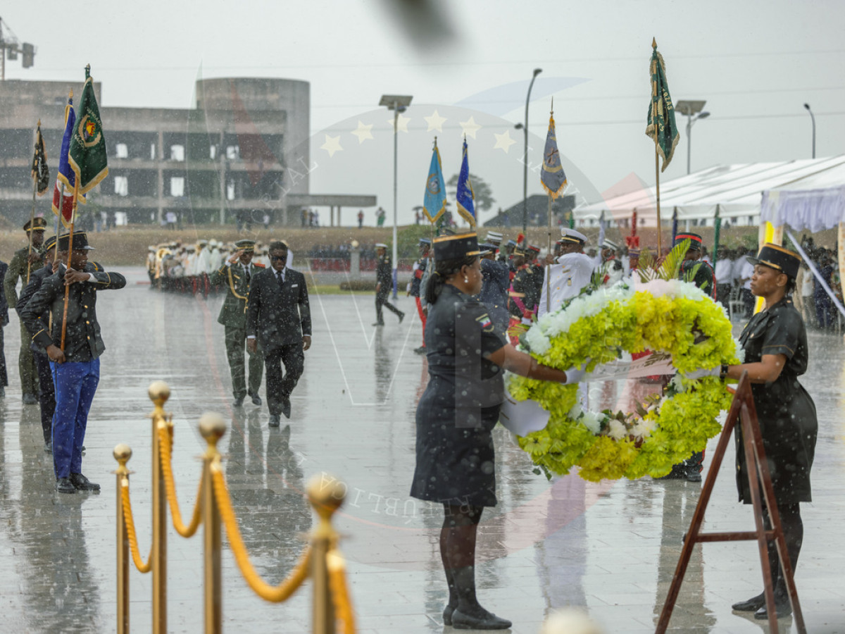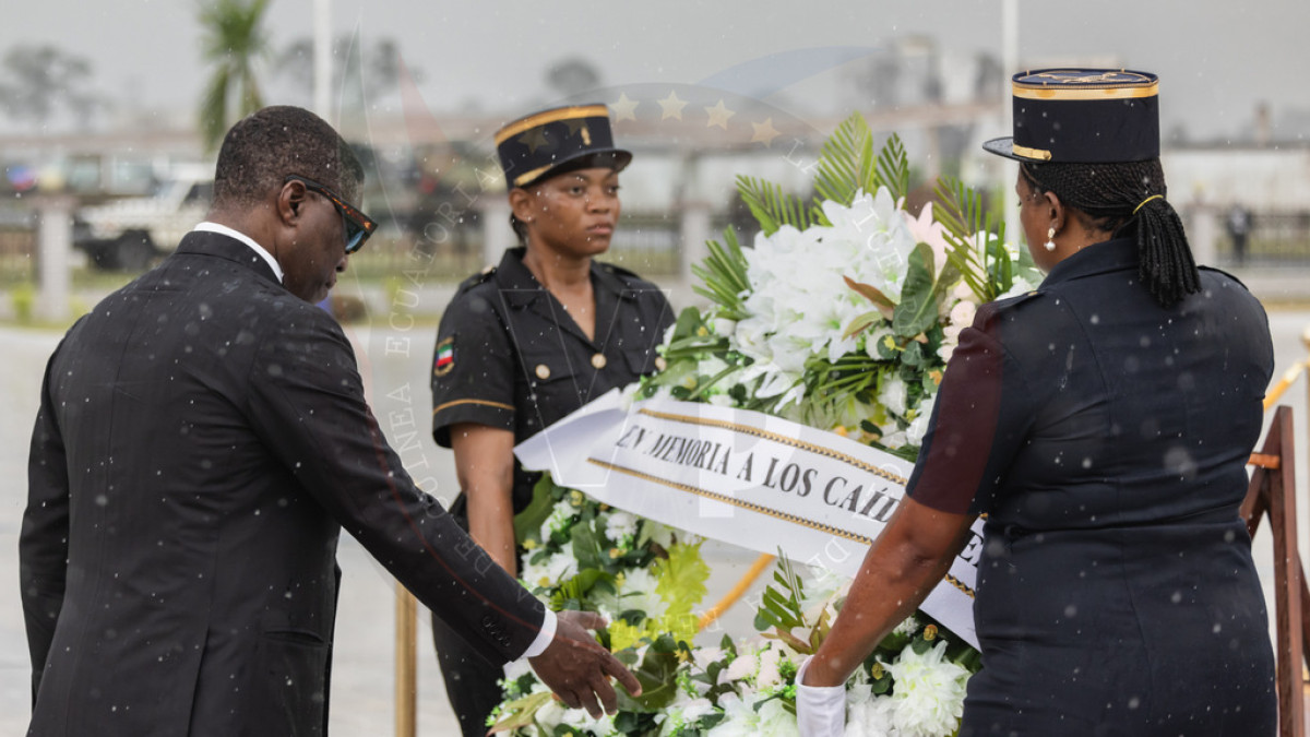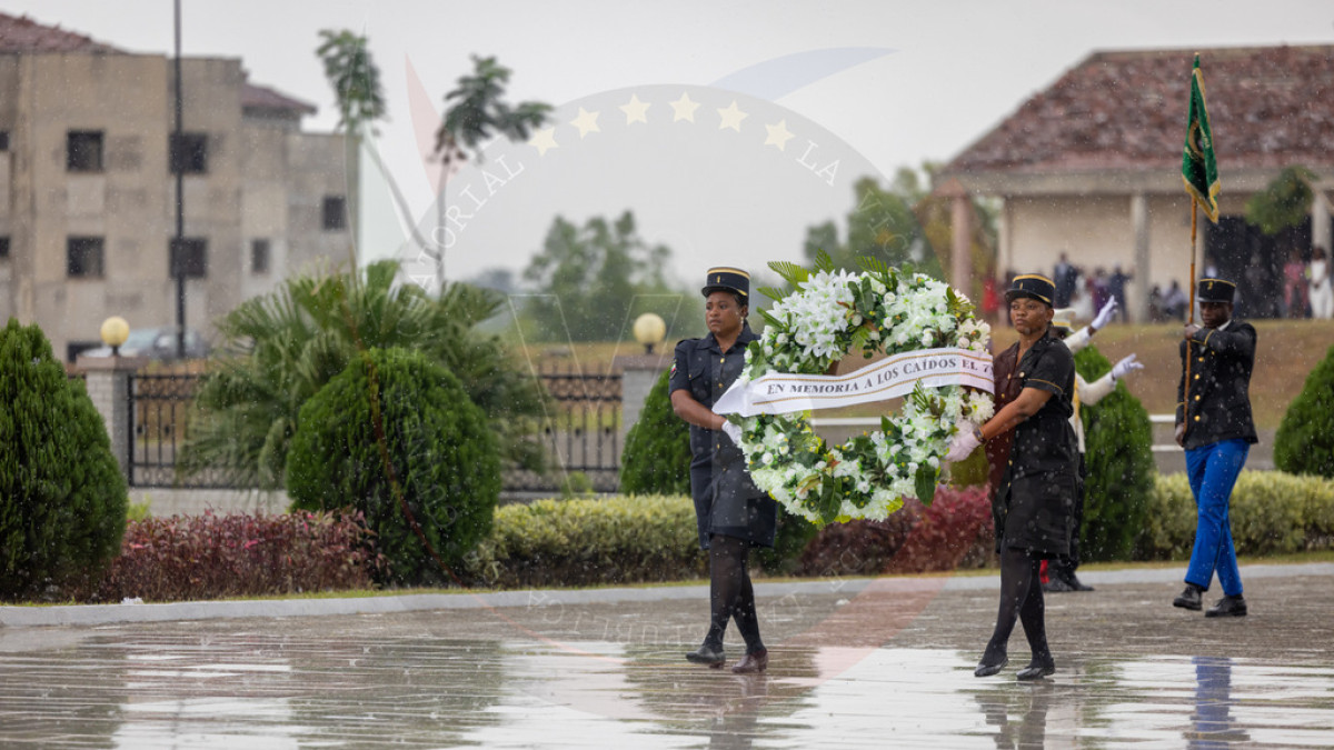 Como símbolo de respeto y memoria permanente, a pesar del cambio de las condiciones meteorológicas, S.E. Nguema Obiang Mangue ha depositado la corona floral en honor a los caídos bajo la lluvia y en medio de aplausos de los presentes por el gesto.